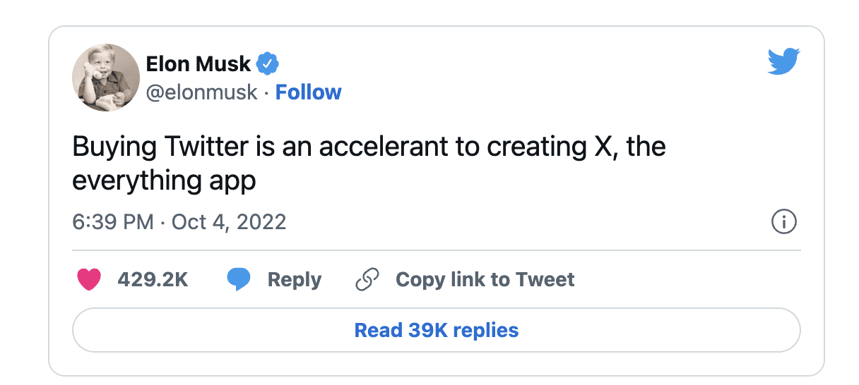 “Buying Twitter is an accelerant to creating X, the everything app,” Musk tweeted on Oct. 4 after striking an agreement with Twitter’s board to go through with the deal. In another tweet the same day, he suggested building off of Twitter would be faster than creating a so-called everything app from scratch.