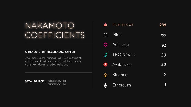 Humanode, a Layer-1 blockchain built with Polkadot SDK, has become the most decentralized blockchain network to date based on the Nakamoto Coefficient. With 706 active validator nodes, the Nakamoto Coefficient for the Humanode is 236, shooting past the prior number one, Mina, which has a Nakamoto Coefficient of 155. Polkadot now holds the 3rd place.