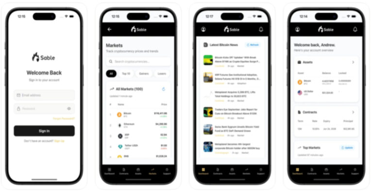 The new app includes a streamlined dashboard featuring real-time Bitcoin balance tracking, active and completed contract views, and direct access to Sable’s latest market research. The interface reflects Sable’s core values — clarity, sophistication, and user empowerment — while maintaining full compliance with institutional security standards such AES-256 encryption, and two-factor authentication.